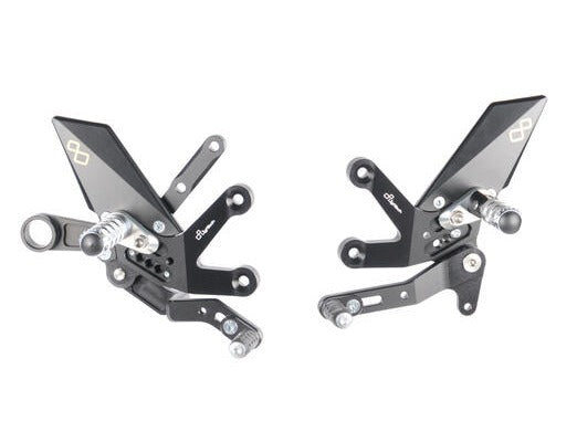 They are adjustable in height and backwards, offering multiple footpeg positions, which can be implemented with the aid of optional footpeg holders. Up to 3 high-quality bearings are integrated into the levers to withstand the most extreme stresses on the road, but especially on the track. The rearsets can be customized thanks to a wide range of accessories and spare parts.
